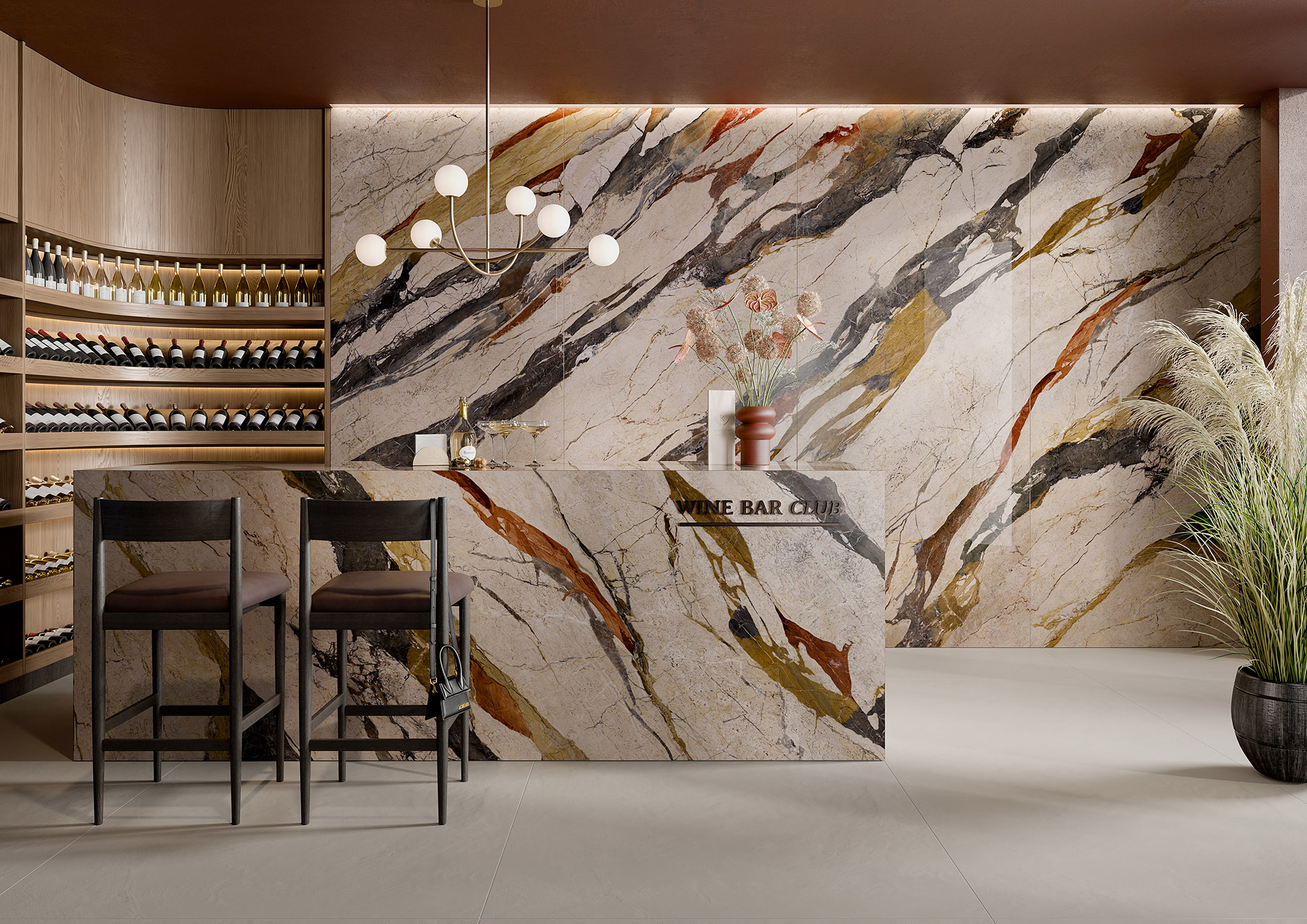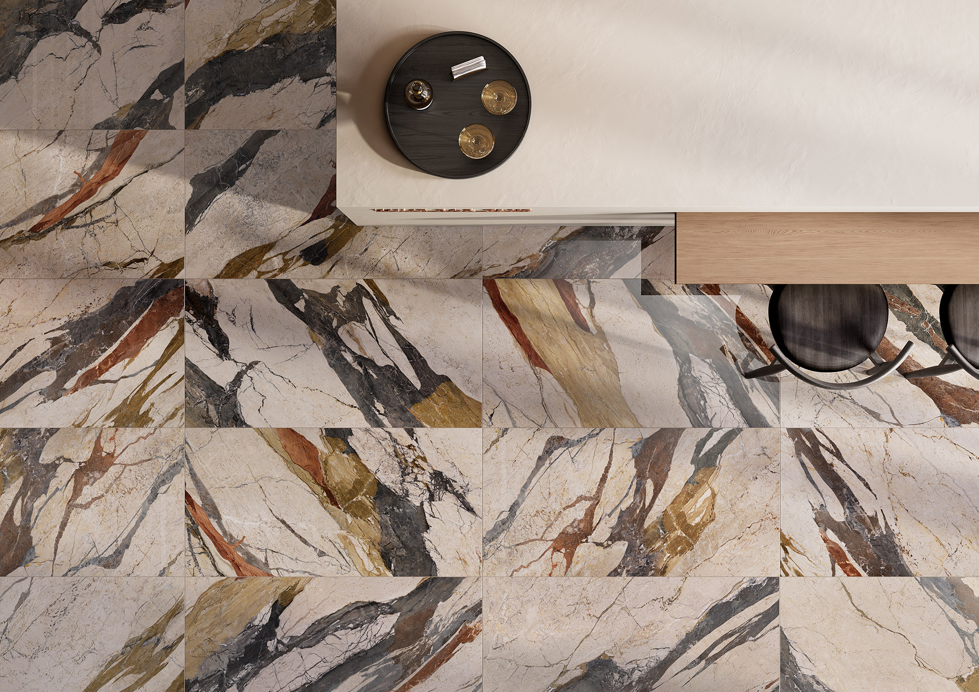 The Breccia Sicilia marble-effect stoneware series is a natural masterpiece, with an incredible fusion of red, brown, and gray tones.