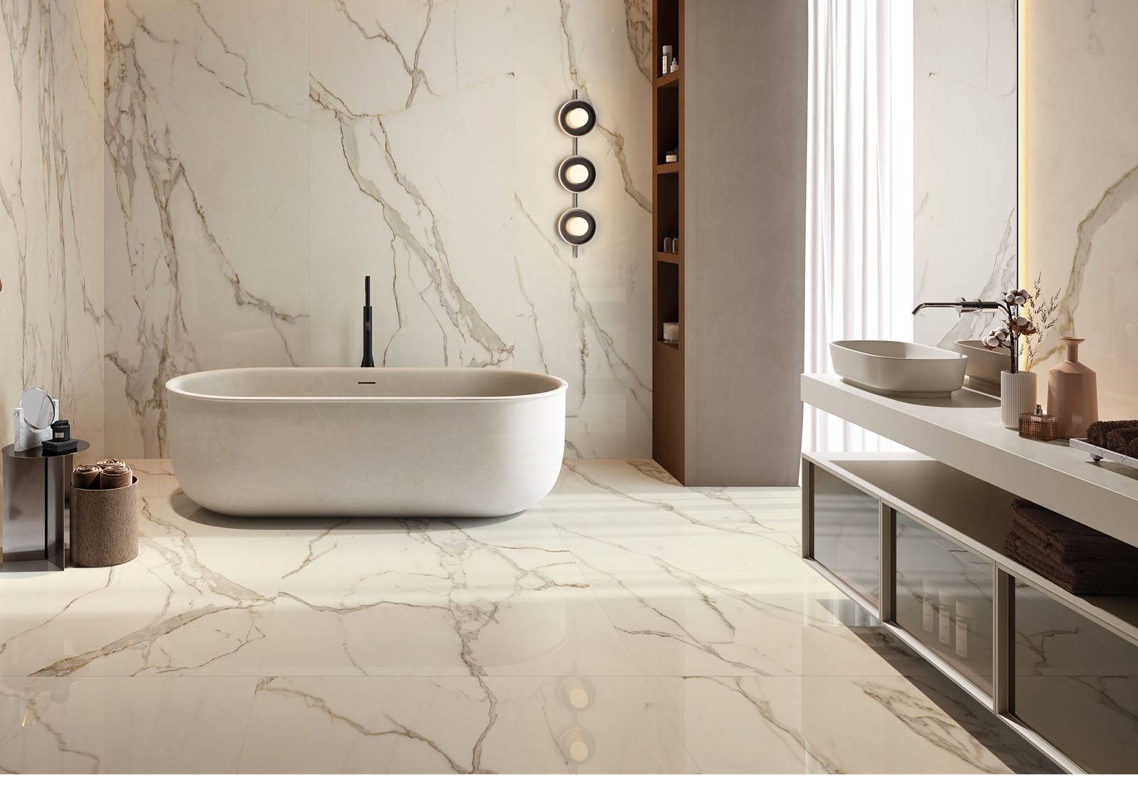Calacatta Oro is a unique marble, inspired by the Renaissance of marble interior decoration and luxury accessories. The undeniable beauty of this precious natural stone from the Apuan Alps in Carrara is characterised by a warm white colour with sinuous grey veins enhanced by elegant golden veins.