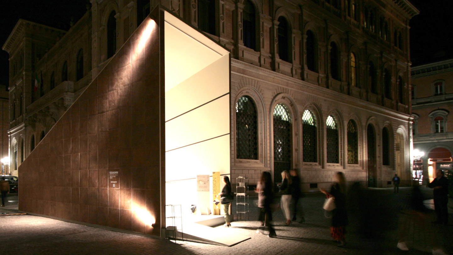 A mini-architecture that delves into the relationship, in terms of proportions, between man and architecture, defined by ceramic panels of the latest generation. The indoor floor of the structure was covered with District Tortora of AVA while the outdoor floor is tiled with Agorà Taksim by La Fabbrica.